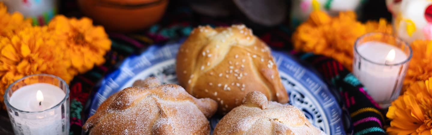 Pan de muerto: Pan tradicionalmente redondo con figuras por encima, aromatizado con flor de naranja, cubierto con una ligera capa de mantequilla y espolvoreado con azúcar, el cual se prepara y consume cada 2 de noviembre para festejar el Día de los Muertos, o bien, para decorar las ofrendas que se colocan para los difuntos de los mexicanos.