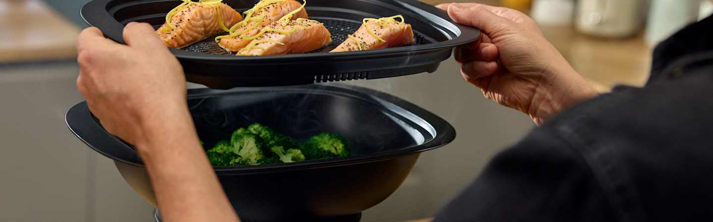 El modo de cocción al vapor te permite cocinar raciones generosas con facilidad. Con el Varoma® más grande, Thermomix® facilita la cocción al vapor de filetes enteros de salmón, verduras frescas y mucho más, todo a la vez y a la perfección.